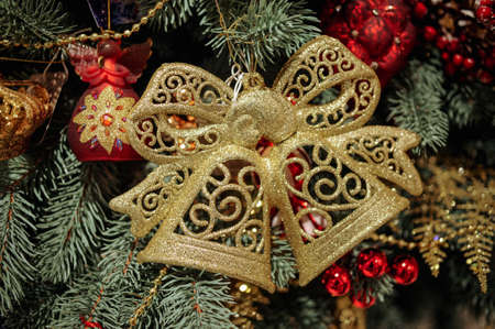 Close-up photo with decorations of christmas tree. Selective focus (Narrow depth of field). Christmas gold bow on a christmas tree branch. New Year's concept