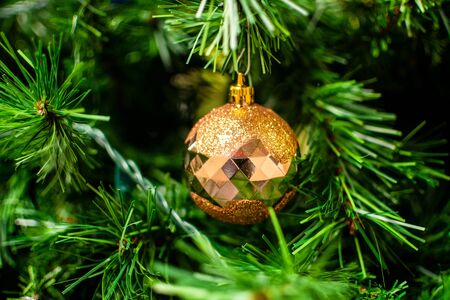 Gold bauble among chistmas tree brenches. Closeup look of the ball