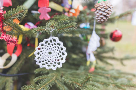 DIY white doily on Christmas tree. Handmade Christmas decoration ideas for children. Environment, reuse, recycle, upcycling and zero waste concept. Selective focus, copy space