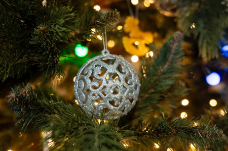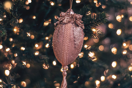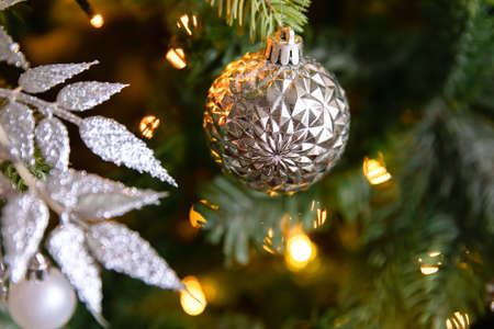 Closeup of sparkling christmas baubles hanging from a decorated tree with soft bokeh lights