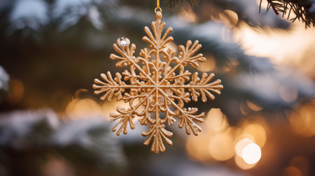 Gold flashing snowflake with diamond close-up as Christmas tree decor