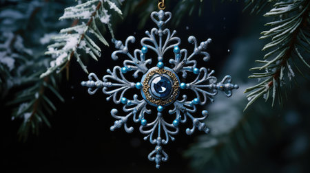 A closeup shot of a beautiful snowflake-shaped ornament on the Christmas tree in winter