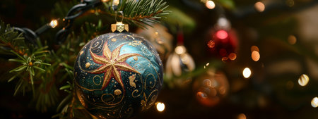 A Christmas ornament hanging from a tree with a blue and gold design. The ornament is surrounded by a warm glow of light, creating a festive and cozy atmosphere