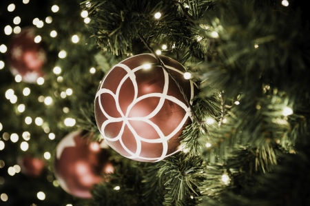 Christmas tree decoration with bokeh background. Vintage style toned picture