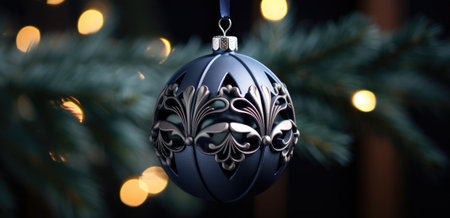 Blue christmas ball hanging on a Christmas tree with bokeh background