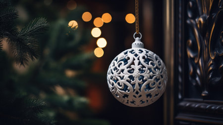Christmas Elegance a stunning white and gold Christmas ornament, elegantly hanging from a festive tree with a soft glow of lights in the background.