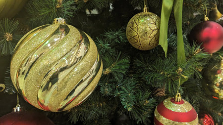 Beautifully decorated Christmas ornaments red and gold hang from lush evergreen tree, creating festive and warm atmosphere. intricate designs and shimmering textures evoke sense of holiday cheer