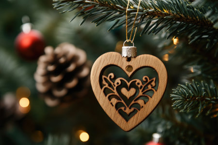 Heart shaped wooden ornament hanging on a Christmas tree with blurred lights and pine cone