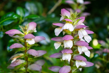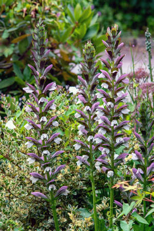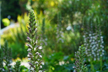 A selective focus of beautiful Acanthus flowers blooming in a garden