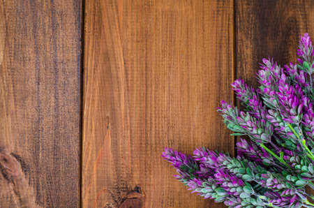 Wooden natural brown background with lilac flowers for text