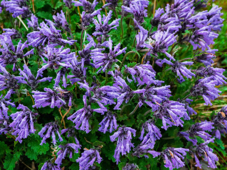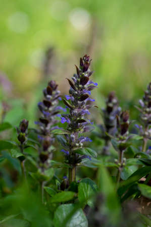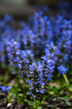 Ajuga reptans blue bugle flowering sprintime plants, group of bugleweed st. Lawrence carpet weed flowers in bloom