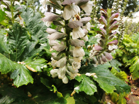 Botanical collection of decorative garden plants and herbs, Acanthus mollis, or bear's breeches, sea dock or oyster plant in blossom