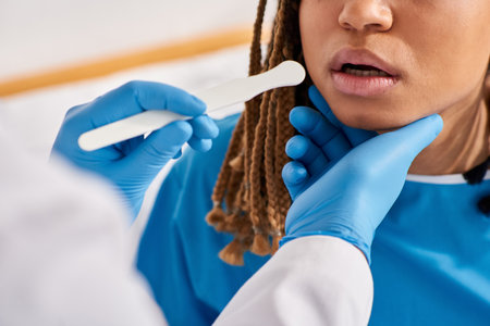 cropped view of young ill african american woman in hospital ward having doctor check up of throat