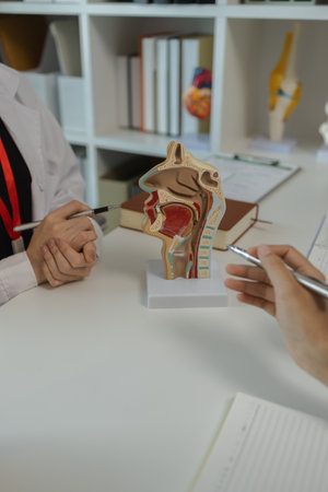 Asian doctor with nasal oral throat cavity neck human anatomy model for study diagnosis and treatment in hospital.