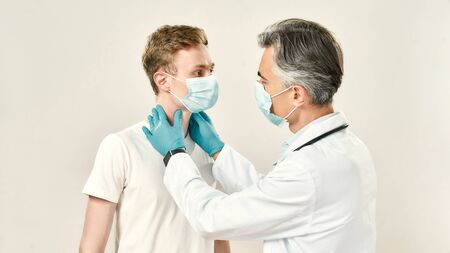 Sore throat. Professional mature doctor checking thyroid glands of young male patient. Doctor and patient wearing medical protective masks, standing against grey background. Healthcare, medicine