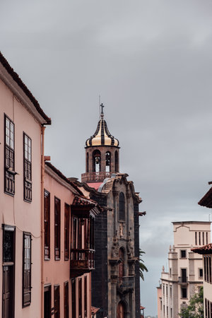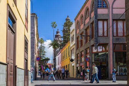 La Laguna, Tenerife, Spain - April 07, 2019. Colourful cozy streets of old capital of the Islaland. Many monuments of history and architecture, churches. Popular tourist destination and attraction.