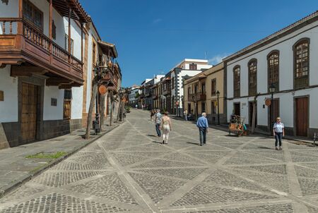 TEROR, GRAN CANARIA, SPAIN - MARCH 08, 2018: View of very cozy street in the historic center. Old houses, ominous from time , tourists and locals walk around.