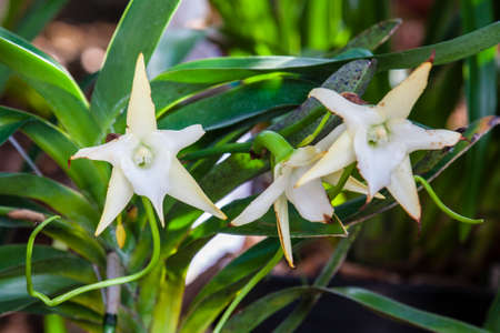 fresh bouquet rhynchostylis white orchid blooming and buds on green tree hanging with green leaves.