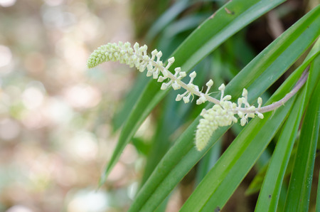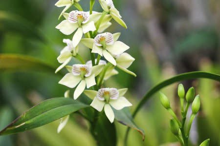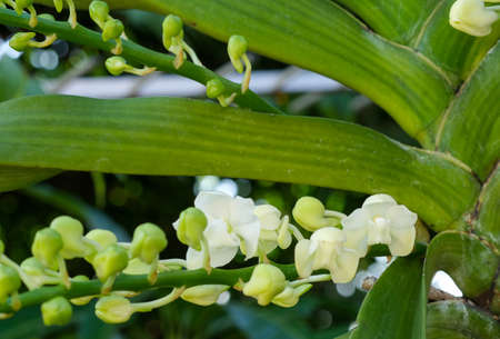 Close up of a tiny beautiful bunch of green white dendrobium orchid flower in a garden