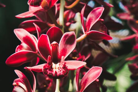 Beautiful red orchid flower growing in the garden on a background of other flowers. For use in a postcard, advertising. Thailand. Natural spring background.