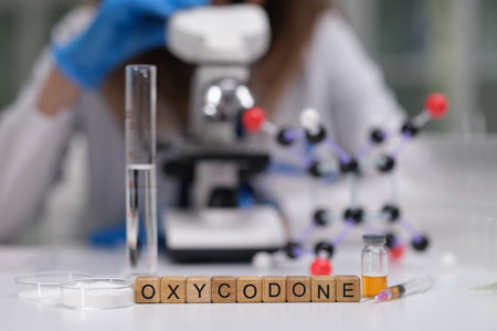 Oxycodone Research Involving Laboratory Equipment Alongside Chemical Structures Analysis