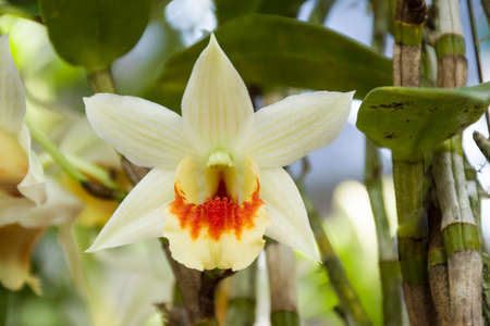 White and yellow Dendrobium thyrsiflorum orchid flowers on its tree with blurry background.