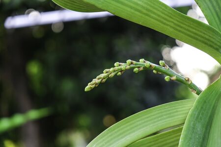 close up bouquet bud orchid flower tree. Green leaves background with copy space. natural wild life fresh plant
