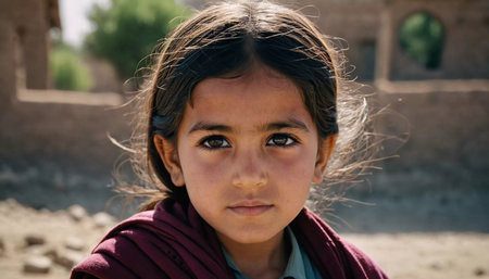 A young girl from Afghanistan stands confidently, showcasing her traditional attire, her expressive eyes reflecting her surroundings and culture. Generative AI.