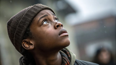 An AI generated illustration of a dark-skinned child, a boy, looking upwards with his hand in a prayer-like gesture