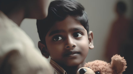 Cute indian little boy with teddy bear toy looking at camera