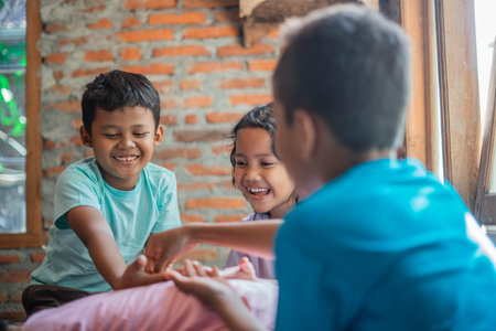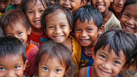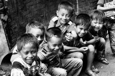 Rantepao, Sulawesi - August 23, 2014: group of unknown indonesian children sitting close together smiling and playing outdoors