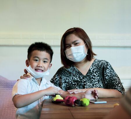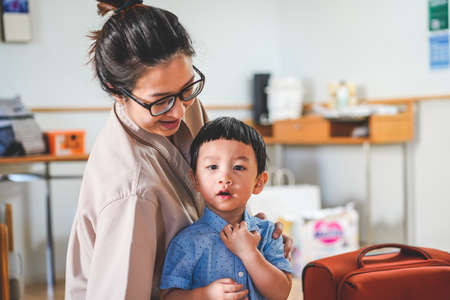 Boy with cerebral palsy and his mom in the conditions of his apartment. Boy reacts vividly to everything that happens around him and shows it with his personality. High quality photo
