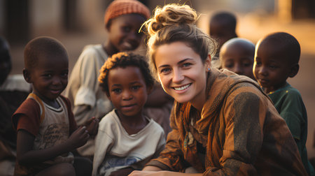 White smiling Caucasian woman teaching African happy children in school class. The concept of education in Africa, learning problems, third world countries, volunteering, helping a school near a village, lack of knowledge teachers, outdoor education.