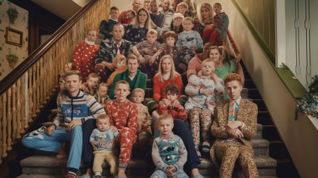 Big family of seven in winter pyjamas having fun in the bedroom with Christmas decor Holiday concept Focus is at the middle blond boy : Generative AI