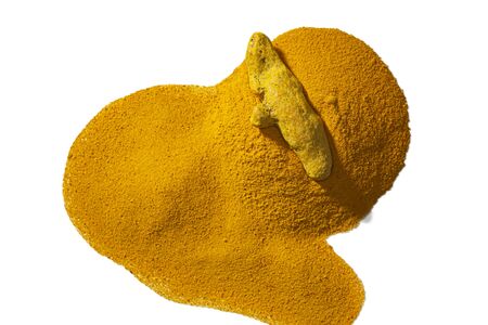 Turmeric powder and turmeric isolated on white background, indian spice,healthy seasoning ingredient for vegan cuisine concept. Top view