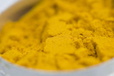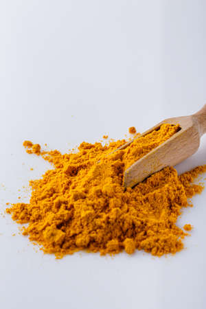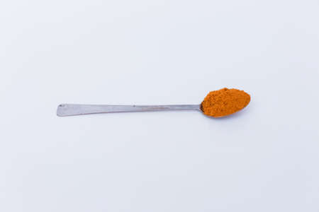 Curry powder in the top of the spoon isolated on white background