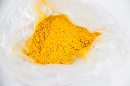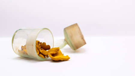 raw Curcuma powder in transparent container, medical spicy aroma, glass jar, plastic bag, isolated on white background, studio shot photography, selective focus, shallow depth of field