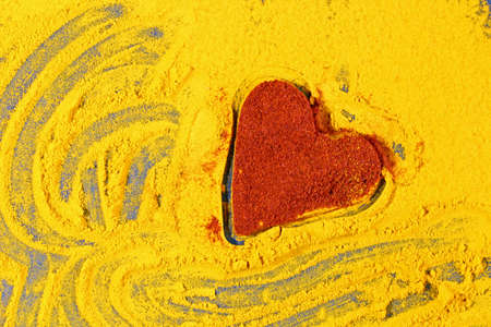 A background of turmeric powdr with a heart shape of parika or red chili powder.
