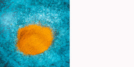 Bright yellow turmeric powder on a colorful background.