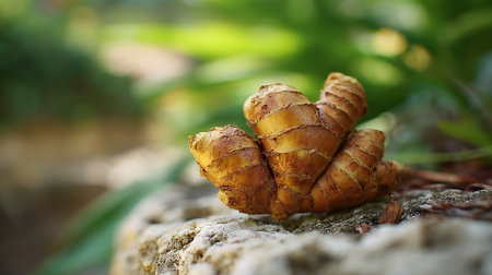 Fresh Galangal Root on Rock Surface with Soft Green Background