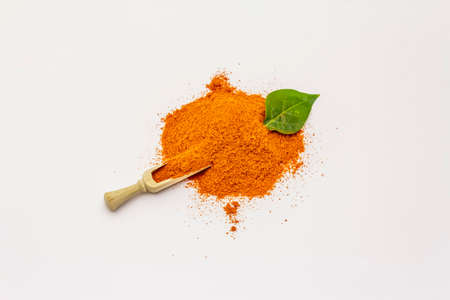 Hungarian hot paprika powder isolated on white background. Heap of traditional seasoning, wooden scoop