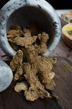 Chinese herbal medicines - Closeup turmeric roots slices on stone background