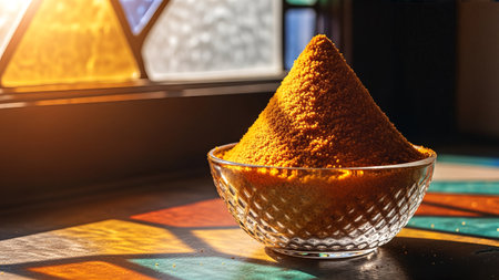 Turmeric powder in a glass bowl on the table near the window