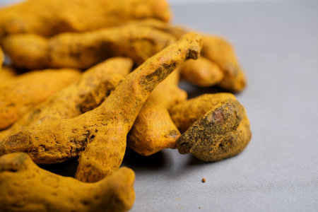 Macro Close-up of Dried Yellow-Orange Turmeric Rhizome Fingers (Curcuma longa) Used as a Potent Spice, Dye, and Natural Supplement.