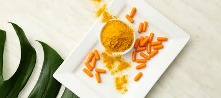 Plate with turmeric pills and bowl with powder on light background