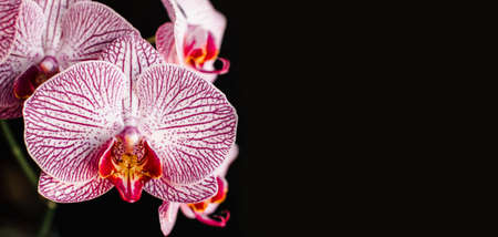 Beautiful fresh orchid flower close up copy space. Floral background.