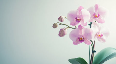 A stunning pink orchid flower is showcased on a soft pink background, highlighting its delicate petals and intricate patterns, perfect for floral and nature-inspired projects.