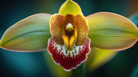 A close-up of Cymbidium orchid, showcasing its rich green and yellow petals with a vibrant red lip