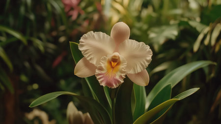 A stunning orchid bloom captured in vivid detail, surrounded by rich, lush greenery. This photograph embodies natural beauty and tranquility. Perfect for nature enthusiasts and floral decor.