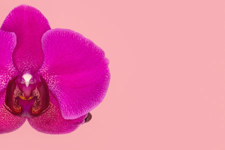 Close up of Phalaenopsis Stellenbosch orchid flowers on pink background, copy space. Tropical flower, branch of orchid close up. purple orchid background. Holiday, Women's Day, Flower Card, beauty.